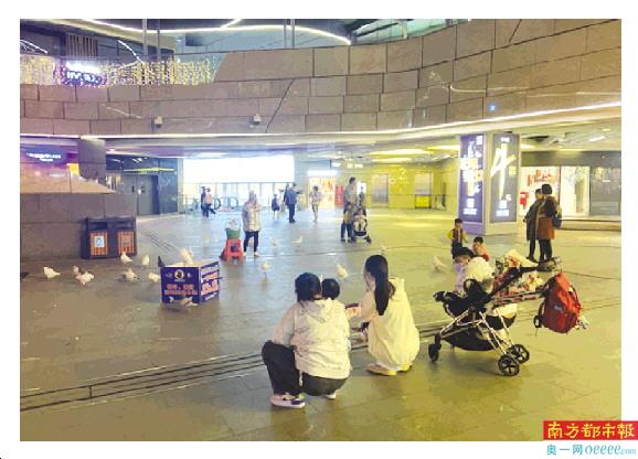 根据官方介绍,每个周末汇港一期的下沉广场会举办音乐表演,不少附近居民坐在楼梯处观看。汇港一期有一块很大的中央空地,几位家长带着小朋友在中间喂鸽子,鸽粮需要另外付费。地上散落着不少羽毛和粪便,走近了就能闻到一阵异味。鸽子投喂点旁边就是儿童滑轮区,但没有任何遮挡隔离。