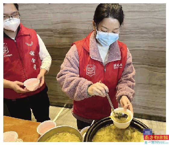 1月13日中午,林萍君来到位于坂田街道创汇国际中心的核酸采样点,她盛着一碗碗热汤,端给一线抗疫人员。这一次,她送来的是猪肉白菜豆腐汤。因为担心工作人员吃得不方便,林萍君提前把骨头捞出来了,留了可以直接吃的猪肉。
