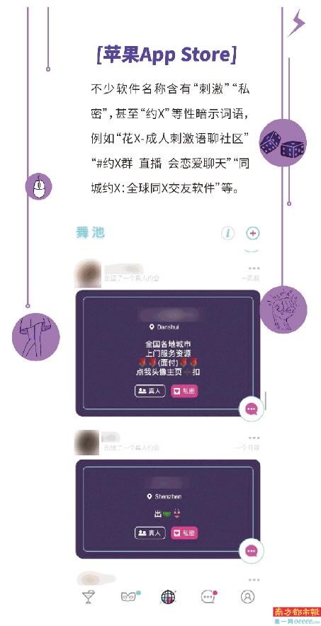 在苹果AppStore搜索结果前30个软件中,不少软件名称含有“刺激”“私密”,甚至“约×”等性暗示词语,例如“花×-成人刺激语聊社区”“#约×群 直播 会恋爱聊天”“同城约×:全球同×交友软件”等。