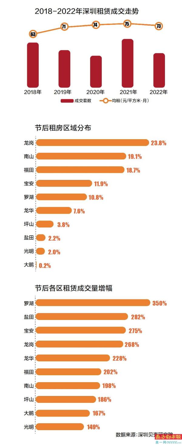 对于节后房屋租金涨价的看法,有房东则表示,“很多房子租得差不多了马上就要涨价,而且涨几百块都很正常。”在房东看来,涨几百块都是正常的,因为是之前跌下来的。事实上,过去一年深圳楼市保持稳中略跌的同时,房租也应声下调。来自乐有家门店的成交数据显示,2022年租赁市场交易量同比下跌28%。行情不好,不少房东减租吸客,租金73元/㎡·月,同比下跌3%。