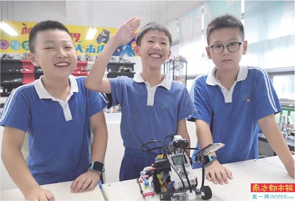 南山区学生在科技实践中,举手示意报告作品完成。