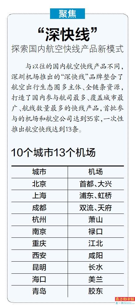 “推出‘深快线’既是深圳机场聚焦市场需求进行的服务升级,也是落实国家战略、助力城市发展、服务旅客出行的重要举措。”深圳机场相关负责人表示,构建覆盖国内主要城市群的航空快线,有助于进一步强化粤港澳大湾区“一点两地”全新定位,促进粤港澳大湾区与京津冀、长三角、成渝等国内主要城市群高效连通,助力国家综合立体交通网建设,为构建以国内大循环为主体、国内国际双循环相互促进的新发展格局注入澎湃动力与活力。
