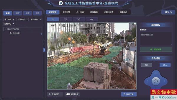 今年以来,光明管理局不断创新监管方式,采用“视频监控+AI识别”、无人机等科技手段,打造“AI云哨”和“空中云哨”两大数字云哨,对全区工地实行扬尘全地域、全天候、全过程、全方位“四全”监管,智能识别工地是否存在场内扬尘污染、泥头车未密闭及清洗、非道路移动机械冒黑烟、裸地未覆盖、出入口抑尘管理不到位等问题,及时发出预警提醒,发现问题即督即改。