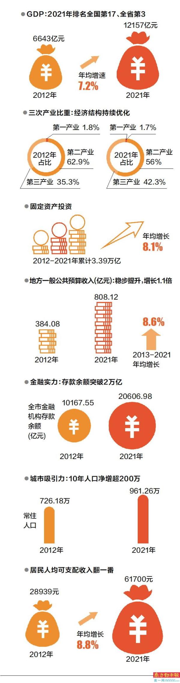 10年间沉淀的一系列经济数据,也成为佛山经济质效向高质量快速跃升的证明。2012-2021年固定资产投资累计3.39万亿,年均增长8.1%。2021年外贸进出口总额达6160.7亿元,年均增速5.3%。全市地方一般公共预算收入从2012年的384.08亿元提高到2021年的808.12亿元,增长1.1倍。金融机构存款余额突破2万亿元,是2012年的2倍。