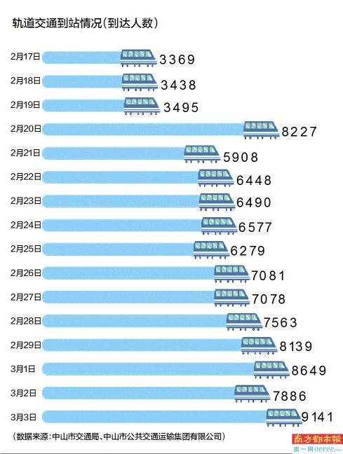 南都记者了解到,随着越来越多的企业开始复工复产,异地务工人员陆续返回中山,因复工时间推迟,且各企业复工日期不一,也导致返岗客流相对分散,因此更容易买到火车票,加之不少跨省长途汽车尚未恢复营运,不少异地务工人员选择轨道交通返岗。中山市交通局提供的数据显示,2月17日全市轨道交通到站旅客3369人次,并保持稳定增长,3月3日到站旅客数量达9141人次,两周时间轨道交通到站旅客数量增加近两倍。