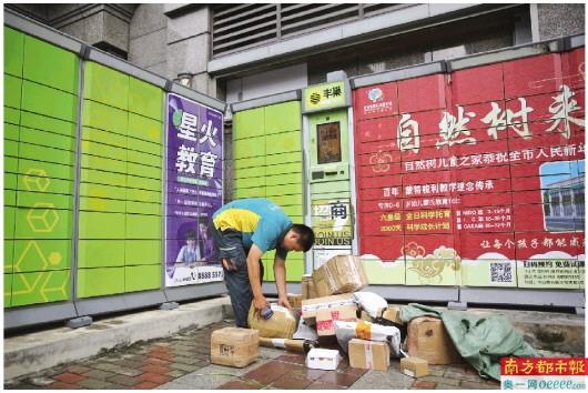 东区朗晴假日一期小区居住时间较长,入住率高,南都记者走访发现,小区内安装有3个快递柜,一个是中邮快递速递易,两个是丰巢。正门入门左转,便是速递易。李女士正在柜前取件,李女士喜欢网购,如果货物很重,快递员会直接送上门,如果是小货物,快递员一般就放快递柜后发个取件码到手机上。“我觉得来快递柜取件挺方便的,毕竟我平时上班不是常常在家,快递上门可能落空,而且陌生快递员上门也有点怪。”