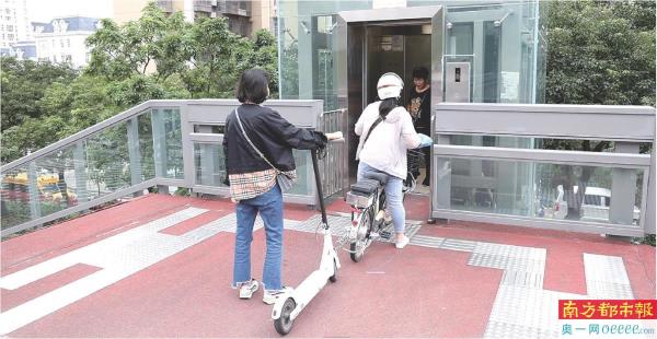 迎宾北路人行天桥,骑电动车的市民进入无障碍电梯。