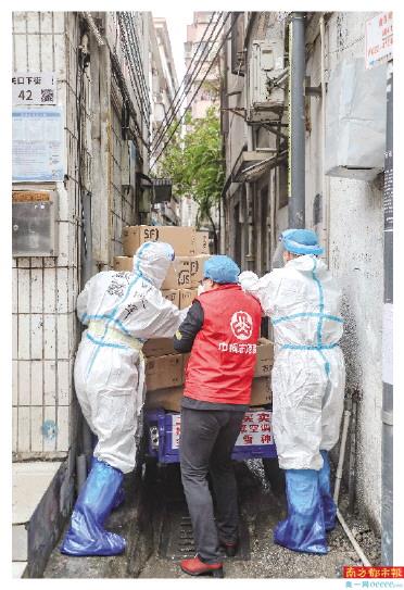 大新北封控期间,南头街道工作人员和志愿者给居民运送生活物资。