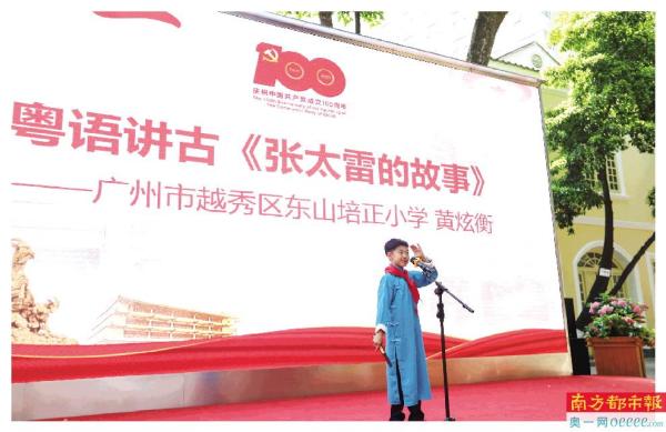 广州红色史迹小讲解员以“粤语讲古”演绎《张太雷的故事》。